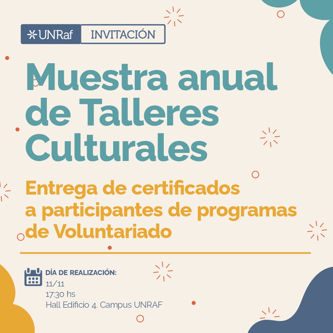 Te invitamos a celebrar el cierre de los Talleres Culturales con una muestra de todo lo aprendido y creado a lo largo del año. 🙌✨ Además, se realizará la entrega de certificados a participantes de programas de Voluntariado. ¡No te lo pierdas!